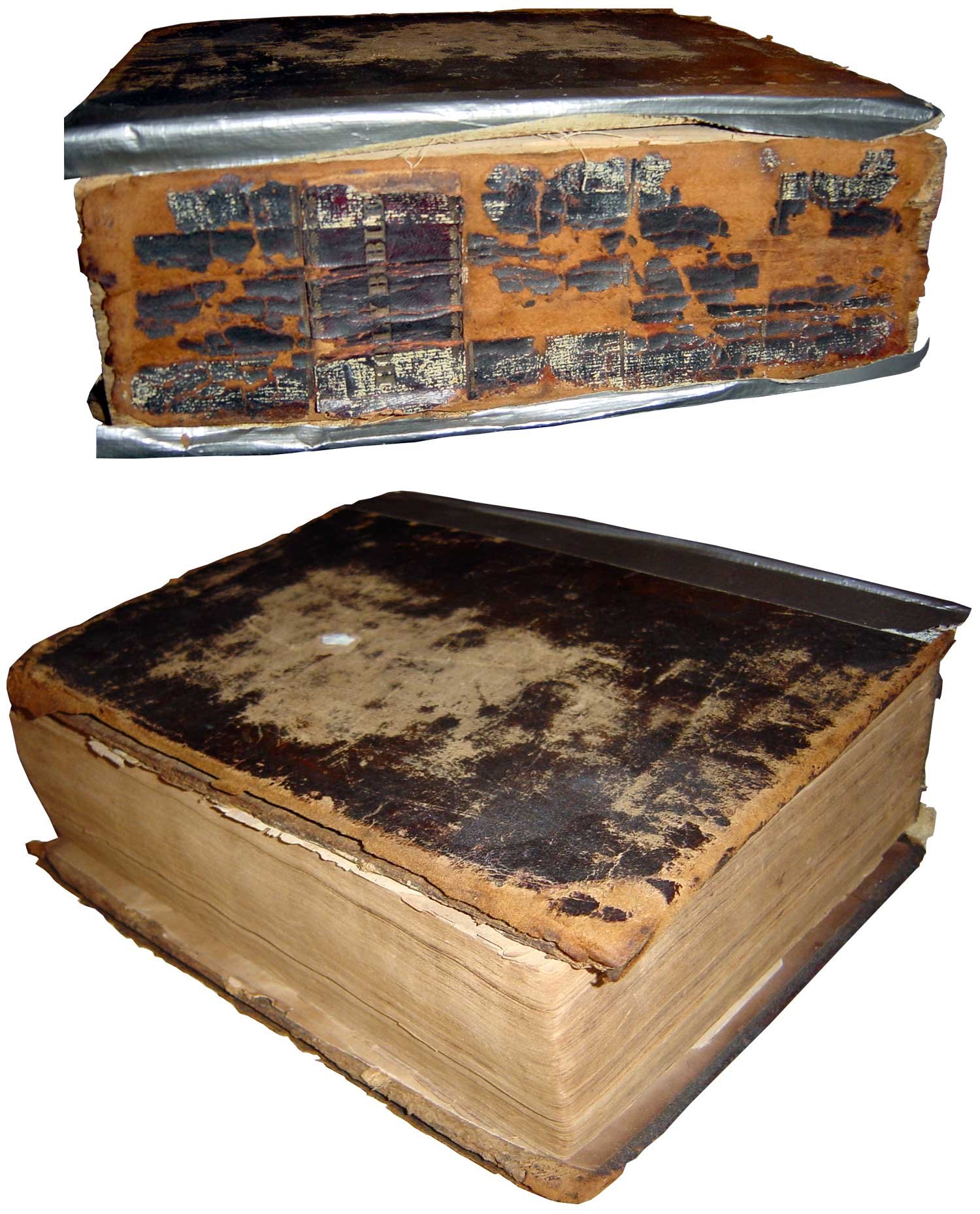 The cover of the bible is quite worn and falling apart.